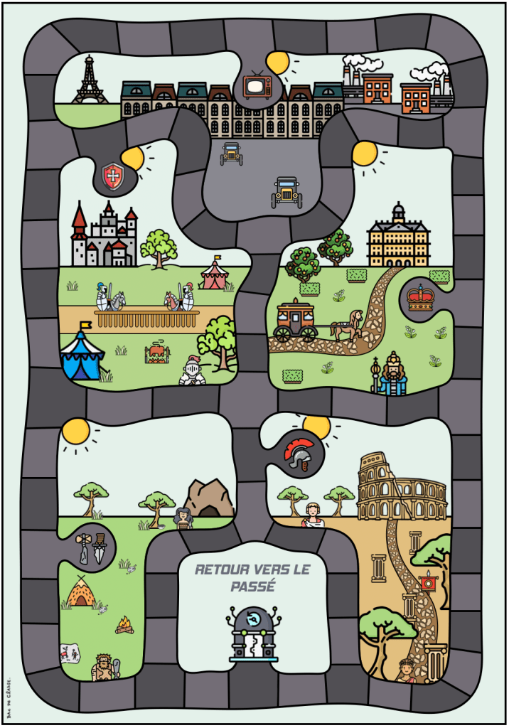Il s’agit d’un jeu d’Histoire à destination des CE2-CM qui permet de réviser les notions-clés sur les périodes historiques en s’amusant.