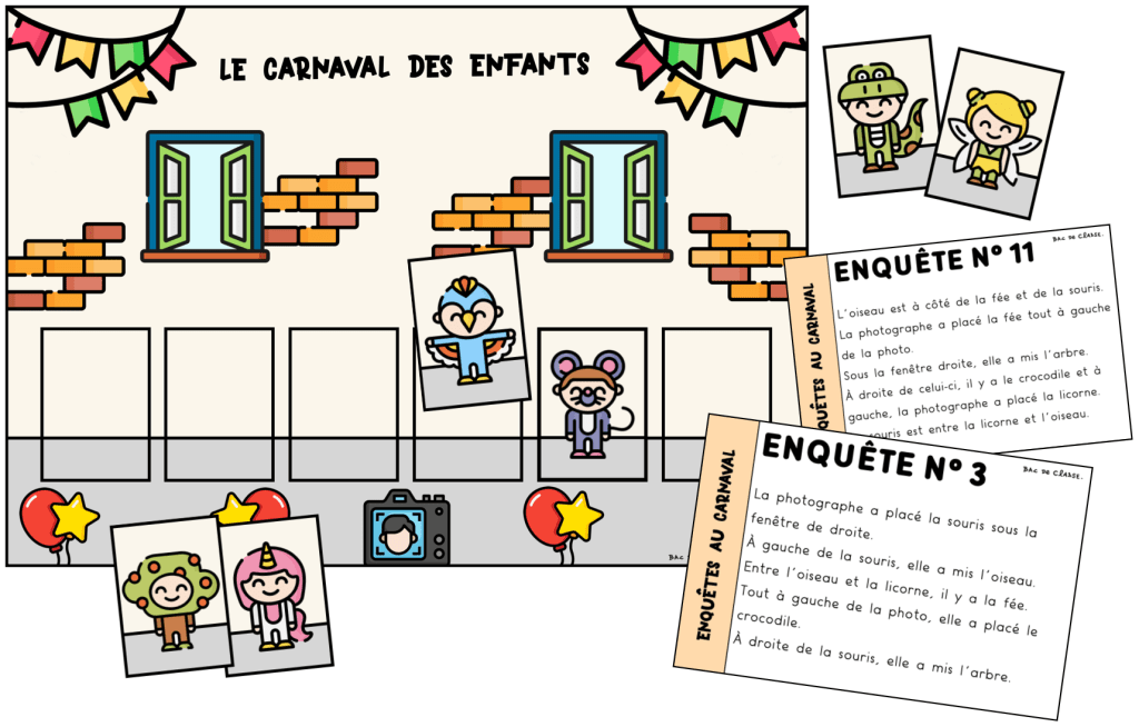 Je vous propose un nouvel atelier de lecture compréhension sur le thème du carnaval. Cet atelier permet de travailler les repères spatiaux comme la gauche, la droite, entre deux, le milieu ou encore à côté de.