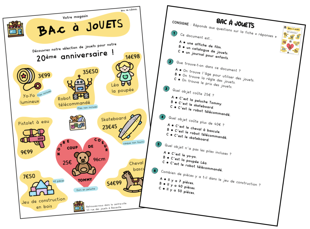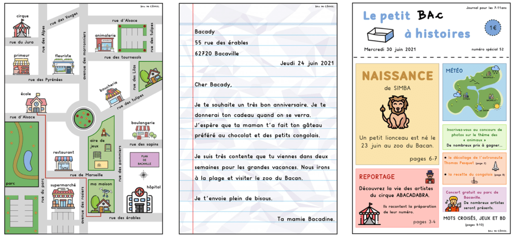 Pour cela, j’ai choisi d’utiliser le thème de l’année de mon école pour créer une histoire filée autour de Bacady (ma mascotte) et Milo, deux personnages qui accompagneront les élèves tout au long de l’année. Bacady fera visiter sa ville à son ami Milo, et chaque semaine, les élèves exploreront un lieu ou un commerce de la ville : la boulangerie, la librairie, le magasin de vêtements, le parc, etc.