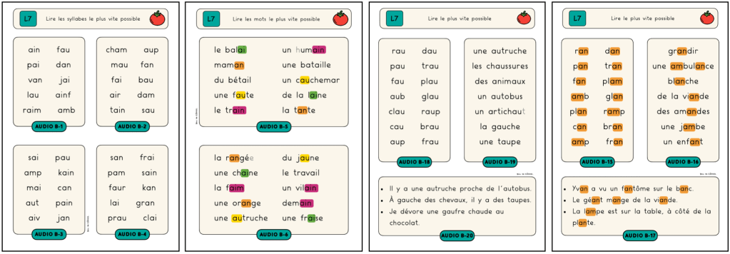 Si vous mélangez les temps, il y a une astuce pour reformer les paquets de chaque temps. Sur le verso de la carte, la lettre F est en couleur. Le « F » vert pour le présent, le « F » rose pour l’imparfait et le « F » bleu pour le futur.